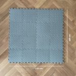 Piastrelle in schiuma da 30 × 30 centimetri. Il kit comprende 16 pezzi (inclusi 2 pezzi extra gratuiti). La superficie totale del tappeto copre 2,5 metri quadrati. Può essere utilizzato in diverse stanze e anche all’aperto.